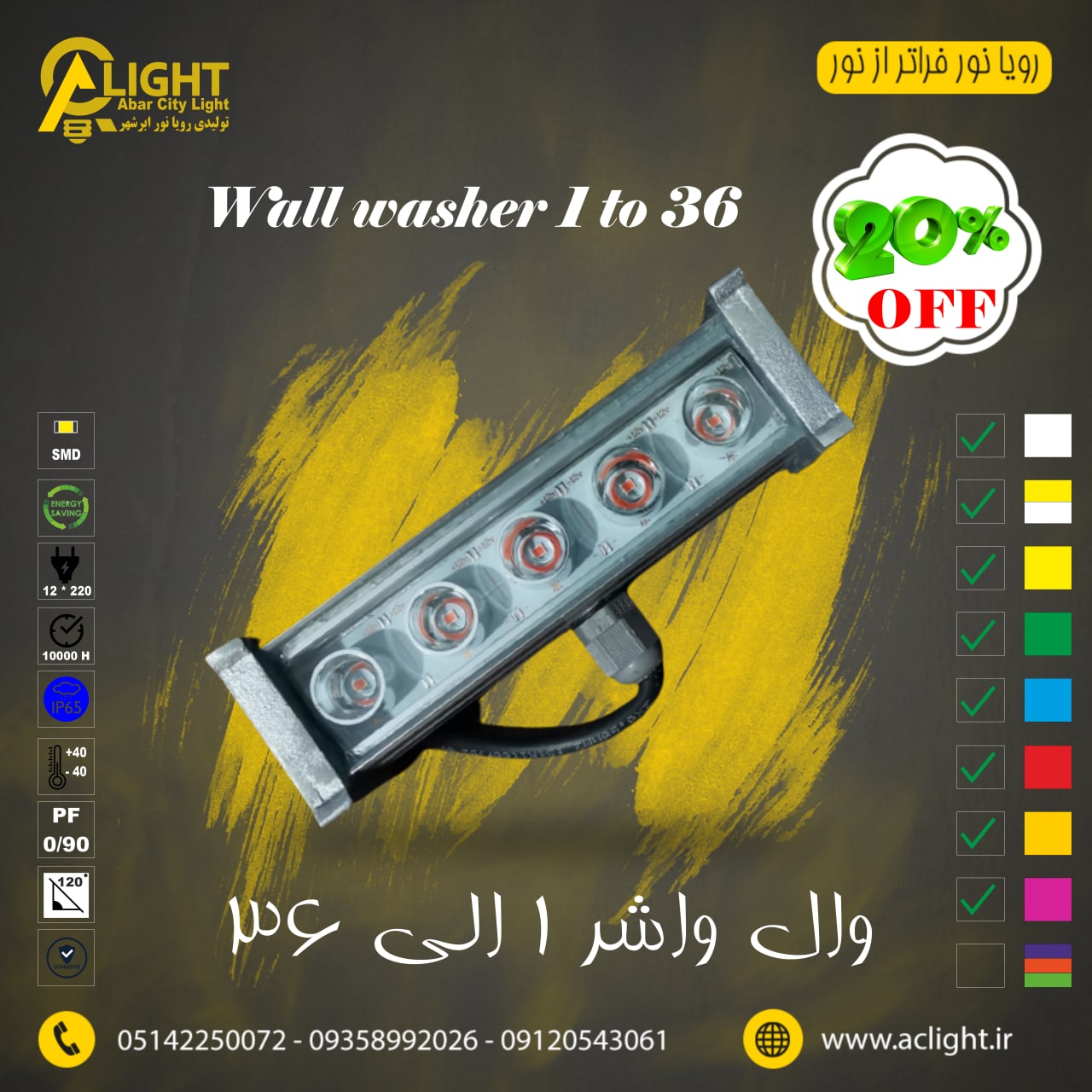 چراغ وال واشر چیست؟ پروژکتور وال واشر یک نوع چراغ خطی است و از تعدادی لامپ LED یا SMD که کنار هم قرار گرفته‌اند، تشکیل شده است. با توجه به استفاده از تکنولوژی ال ای دی در ساخت والواشر، این محصول مصرف برق بسیار کمی دارد و هزینه برق را به مقدار قابل توجهی کاهش می‌دهد. وال واشرهای عرضه شده در بازار رنگ، توان و ابعاد متنوعی دارند و برای نورپردازی نمای خارجی ساختمان‌ها و فضای داخلی منازل، دفاتر اداری و … به کار می‌روند. این چراغ‌ها عموما بر روی سقف، کف اتاق‌ و دیوارها نصب می‌شوند. وال واشر تنها برای نورپردازی و روشن کردن محیط به کار نمی‌رود، با نصب این چراغ‌ها در راهروهای باریک و بر روی دیوارها می‌توان باعث شد که محیط بزرگتر به نظر برسد. همچنین با نصب این محصولات در نمای خارجی ساختمان‌ها، معماری کلی ساختمان بهبود پیدا می‌کند. چراغ وال واشر برای نورپردازی کدام مکان‌ها مناسب است؟ رستوران‌ها و کافی شاپ‌ها نمای خارجی ساختمان‌های مسکونی و اداری نورپردازی میدان‌ها و خیابان‌ها فضای سبز و پارک‌ها دیوار و سقف راهروهای منازل مراکز تجاری و فروشگاه‌های بزرگ گالری‌های هنری و موزه‌ها